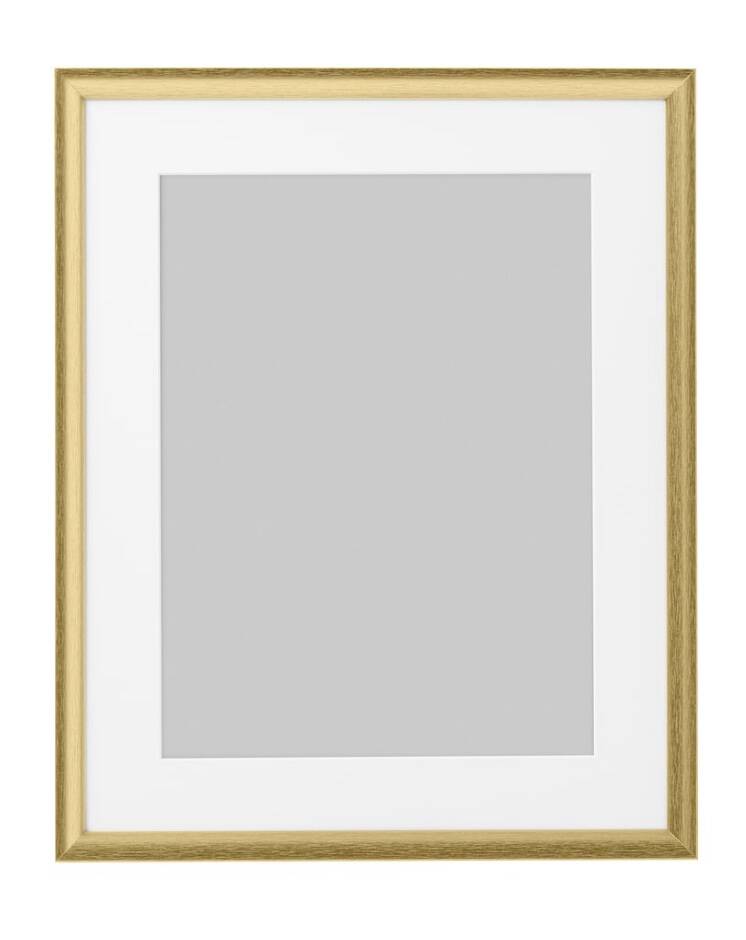 Deze lijst van IKEA heeft een dunne rand als lijst. De rand is metallic goud van kleur en is glad (er zit geen patroontje of iets in). Je kunt deze lijst ophangen of neerzetten!